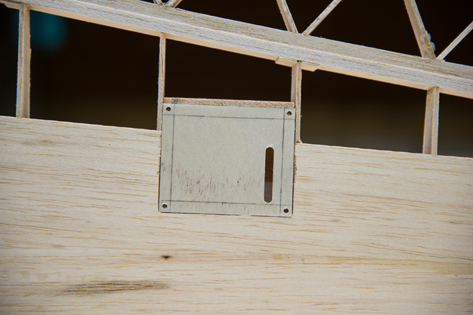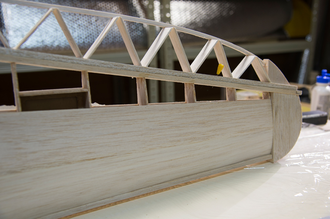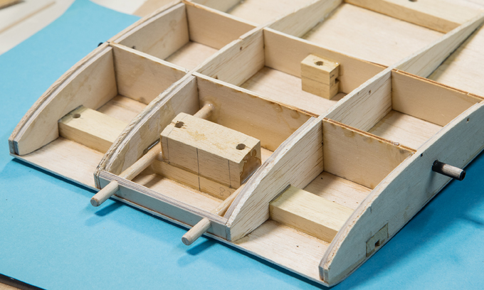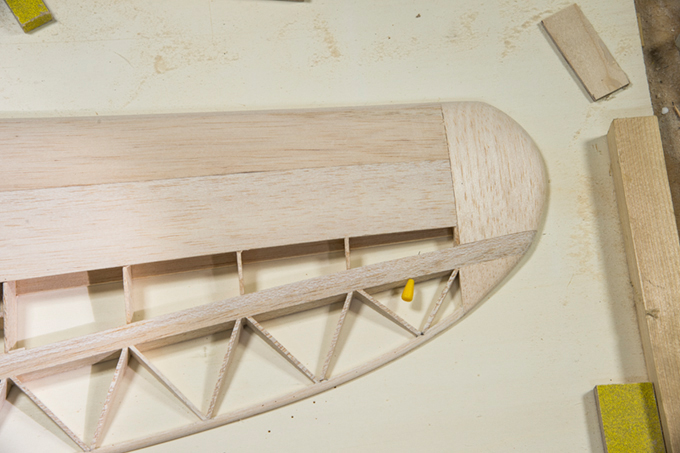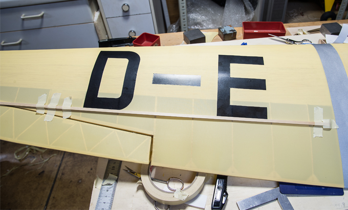 geknickt. Die 2 inneren Rippen ligen 5mm höher. Die Beplankung wird wie in der Bauanleitung beschrieben leicht angeritzt. |