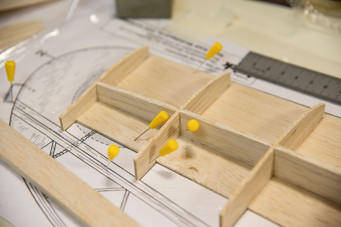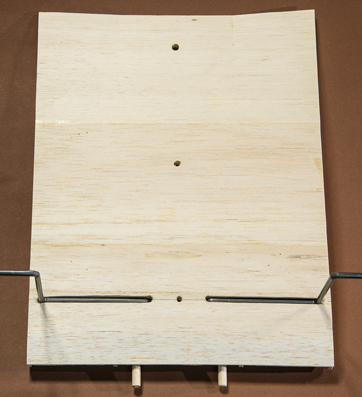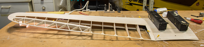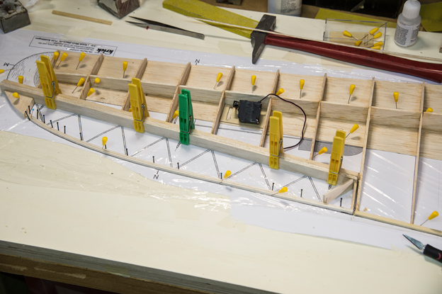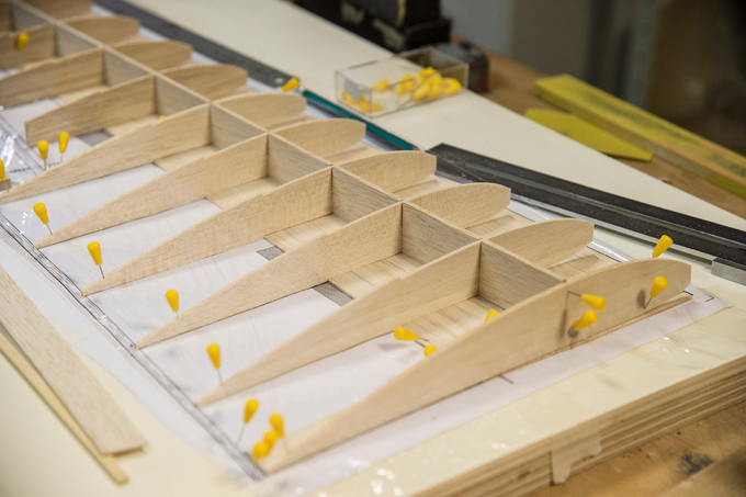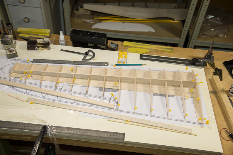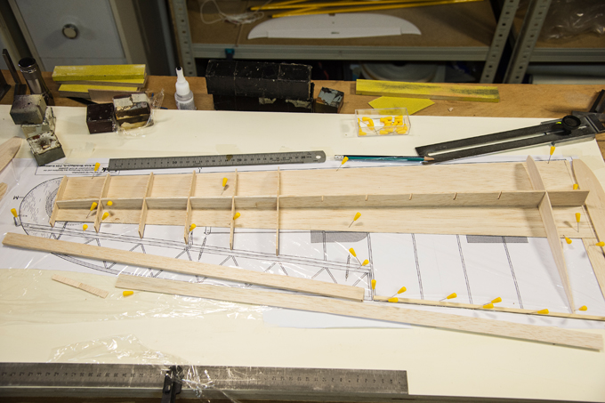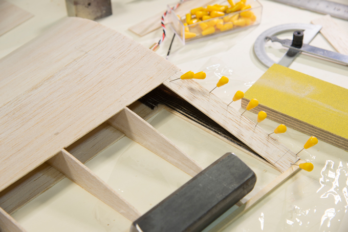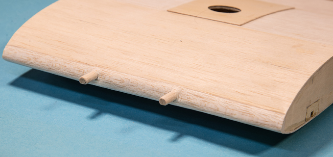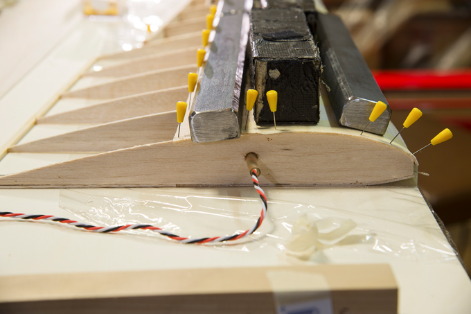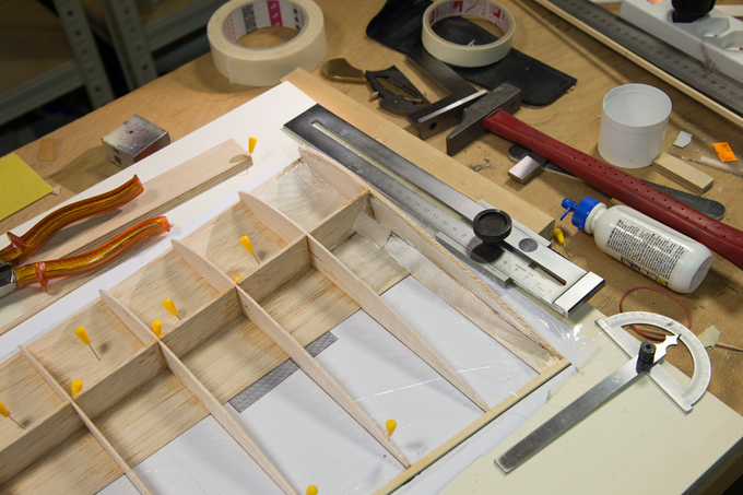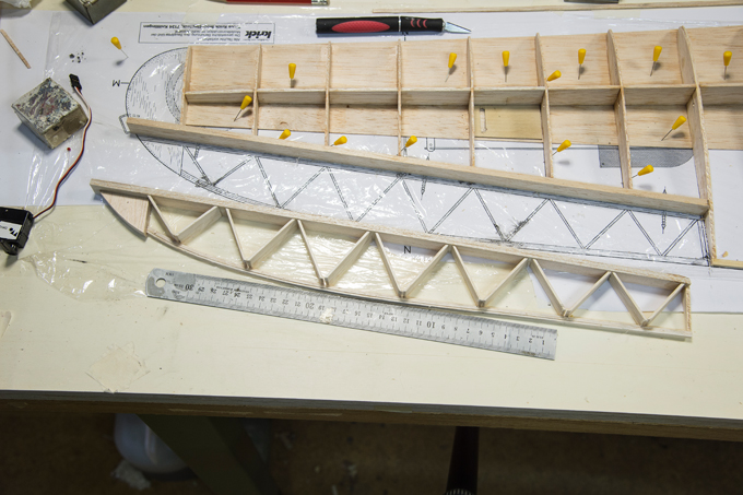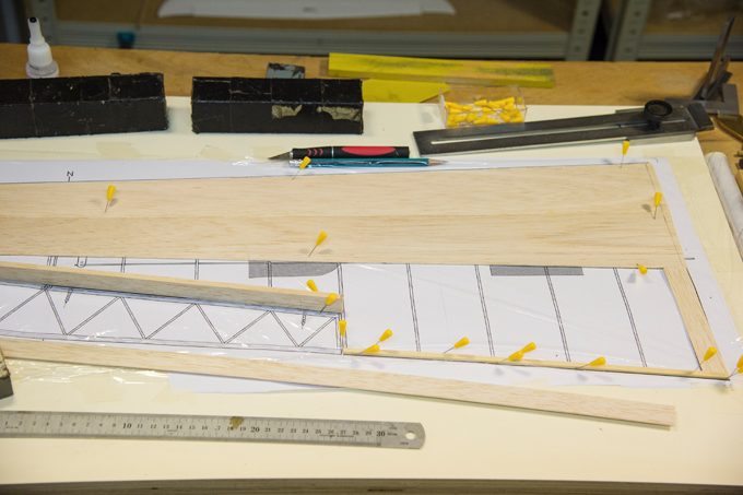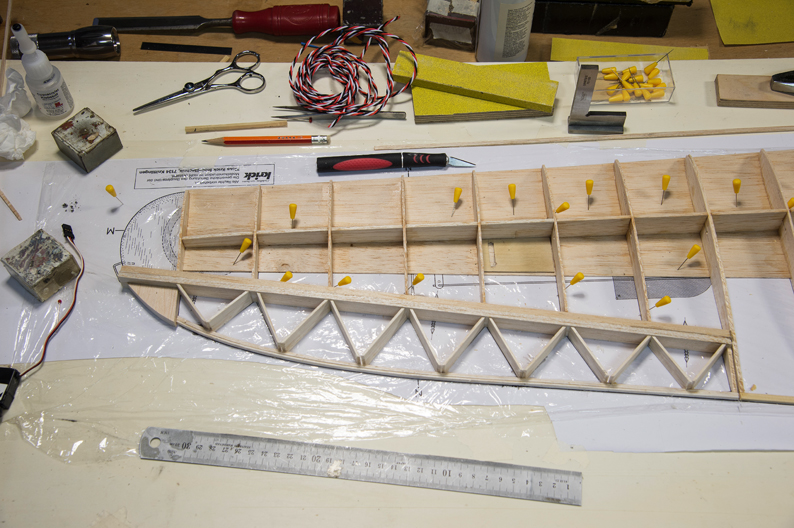 Querruder erschien mir zu kompliziert und unrealistisch, -eine 5mm breite Leiste im Radius, in 3 Teile aufzusägen. Ich habe dazu 3 Balsaleisten a 1.5 x 4.5mm verleimt und bin mit Hilfe von Stahlstiften dem Radius des Plans gefolgt.