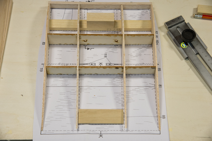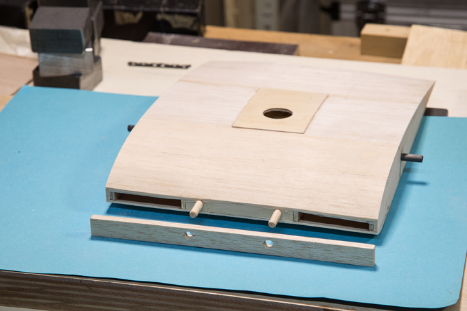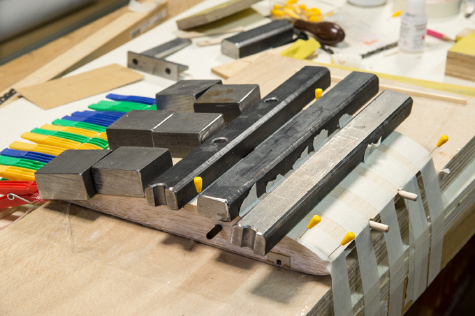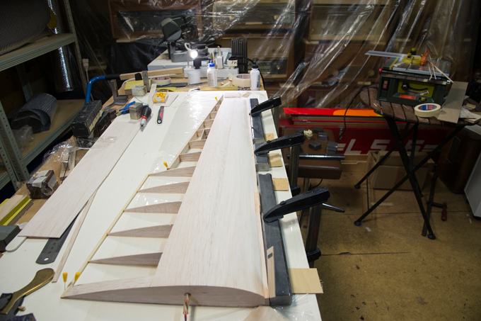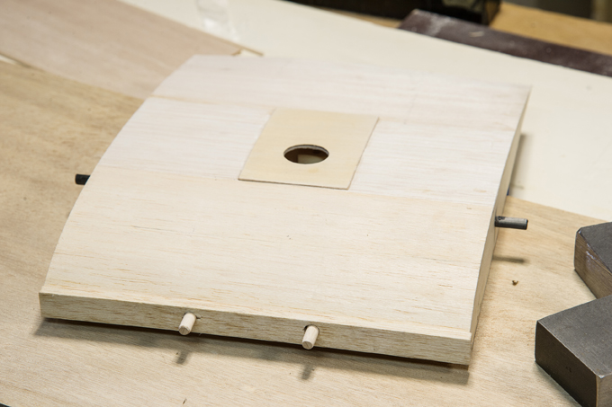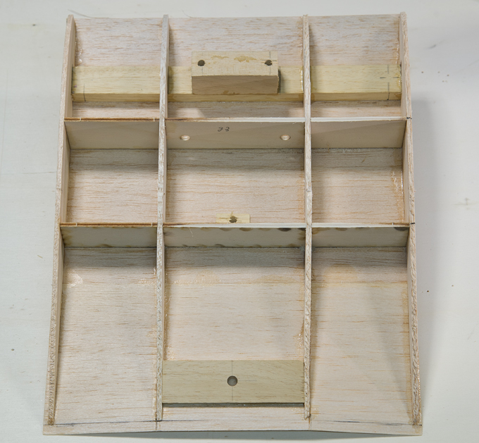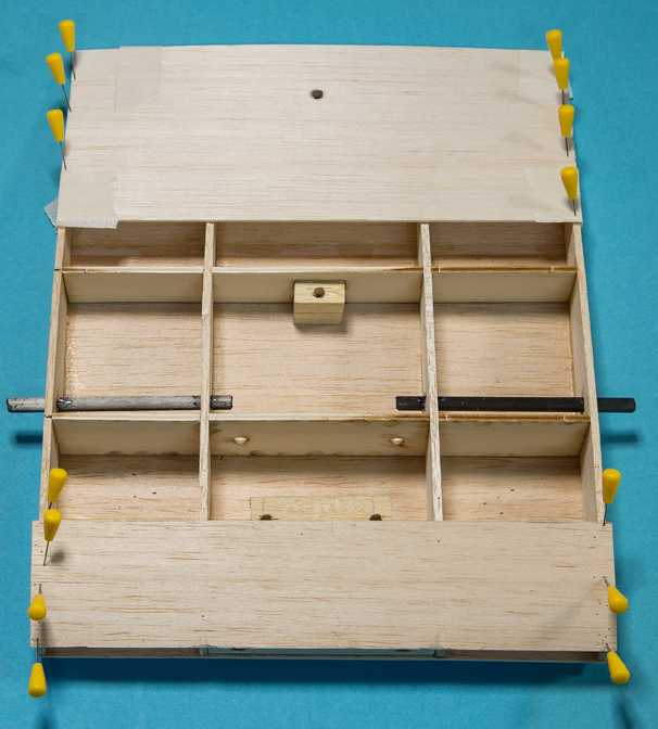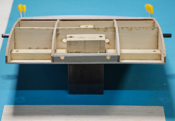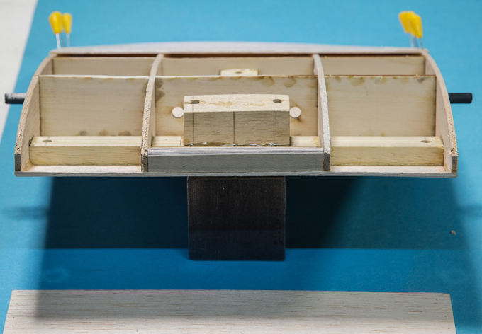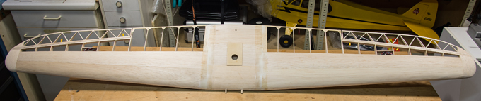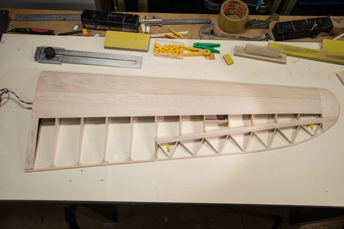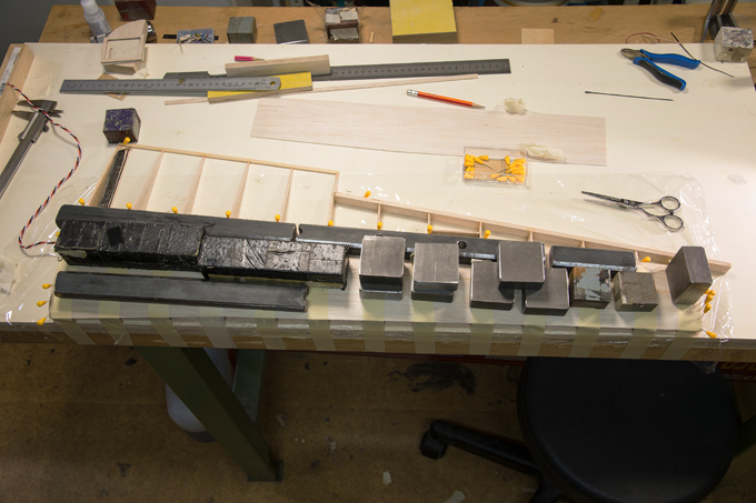 Querruder erschien mir zu kompliziert und unrealistisch, -eine 5mm breite Leiste im Radius, in 3 Teile aufzusägen. Ich habe dazu 3 Balsaleisten a 1.5 x 4.5mm verleimt und bin mit Hilfe von Stahlstiften dem Radius des Plans gefolgt.