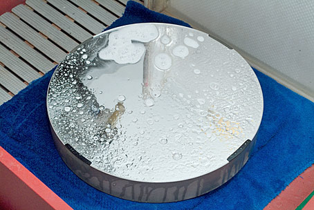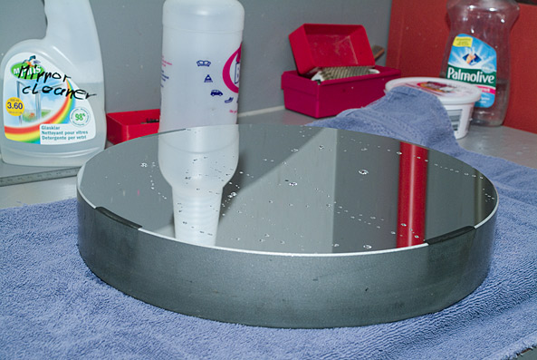 Renigungs - Fluid Meine bevorzugte Rezeptur: 1.Destiliertes Wasser 9/10tel 2.Isopropyl-Alcohol 1/10tel fördert schnelles abtrocknen, beseitigt Mikroben. 3.Einen Tropfen Spühlmittel Mixtur in Sprühflasche abfüllen. Aufsprühen und ca. 5Min. einwirken lassen. Wichtig: keine mechanische Einflussnahme, Spiegelfläche nicht berühren und nach dem klarsspühlen nur trocknen lassen. |